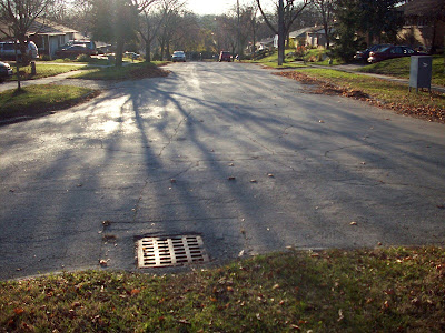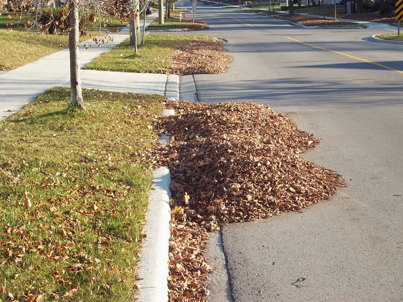 Description: A road on the right complimented by a boulevard and sidewalk on the left. The road has piles of leaves on it that have been raked there for pickup.