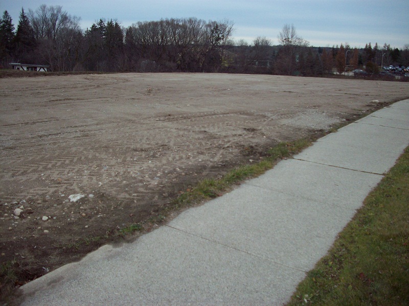 Description: A sidewalk before an open expanse of dirt that has been driven over by numerous machines