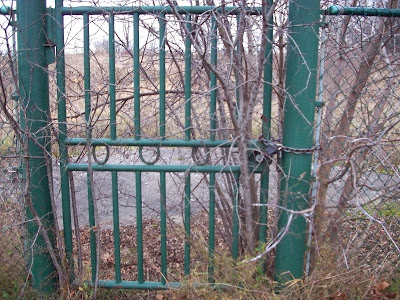 Description: A green fence with a locked gate in the middle, and a tree behind it that has grown through the gate