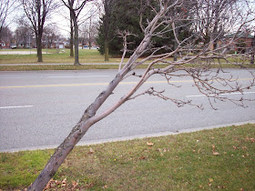 Description: A tree growing at a roughly 45 degree angle in the foreground, Frederick Street in the mid-ground, and numerous trees in front of Weber Park in the background.