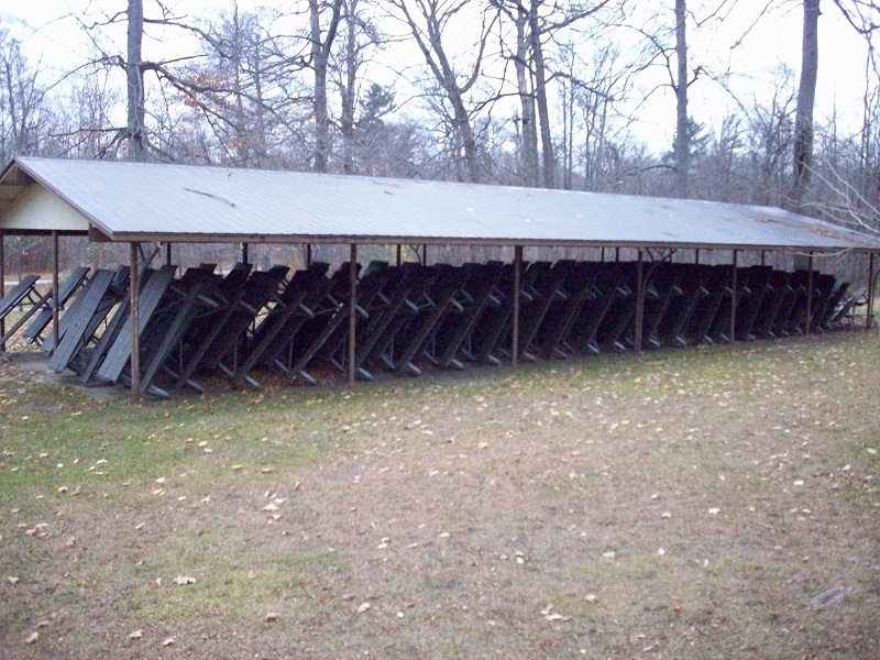 Description: A shelter in a wooded area containing numerous picnic tables, at least four rows deep and twenty long.