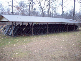 Description: A shelter in a wooded area containing numerous picnic tables, at least four rows deep and twenty long.