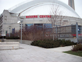 Description: The Rogers Centre with a garden/patio area in the foreground and the CN Tower behind on the right.
